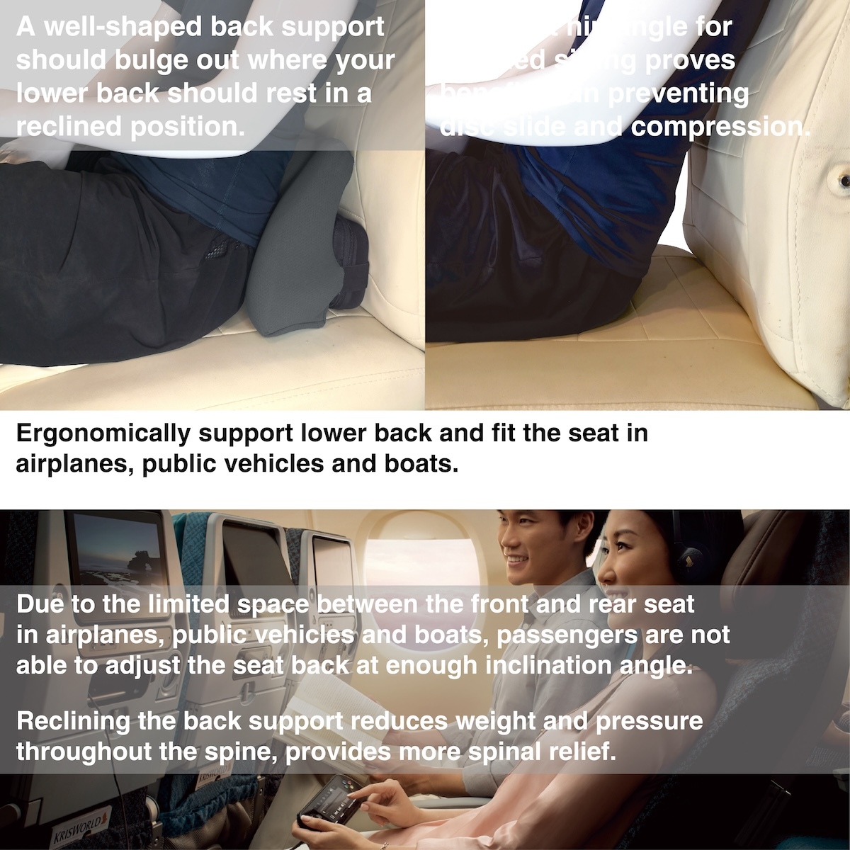 Ergonomically support lower back and fit the seat in airplanes, public vehicles and boats
