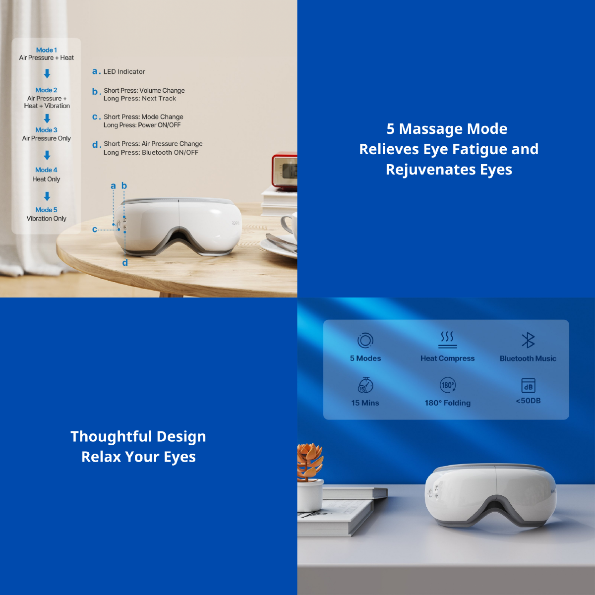 • allows you to experience the air pressure, hot compress, and vibration massage simultaneously