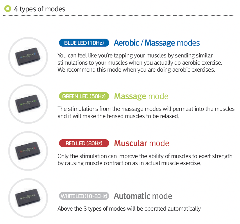 4 electrical stimulation programs (aerobic, massage, strength, endurance) for different fitness goals