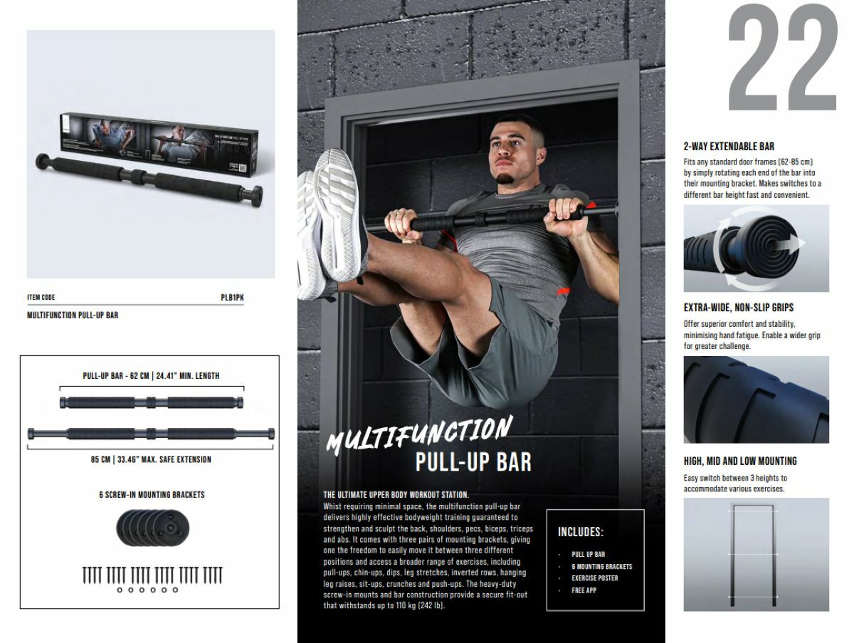 2-way extendable bar fits any standard door frames (62-85 cm) by simply rotating each end into a mounting bracket.