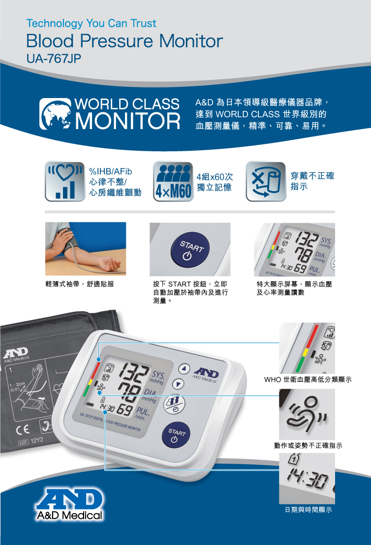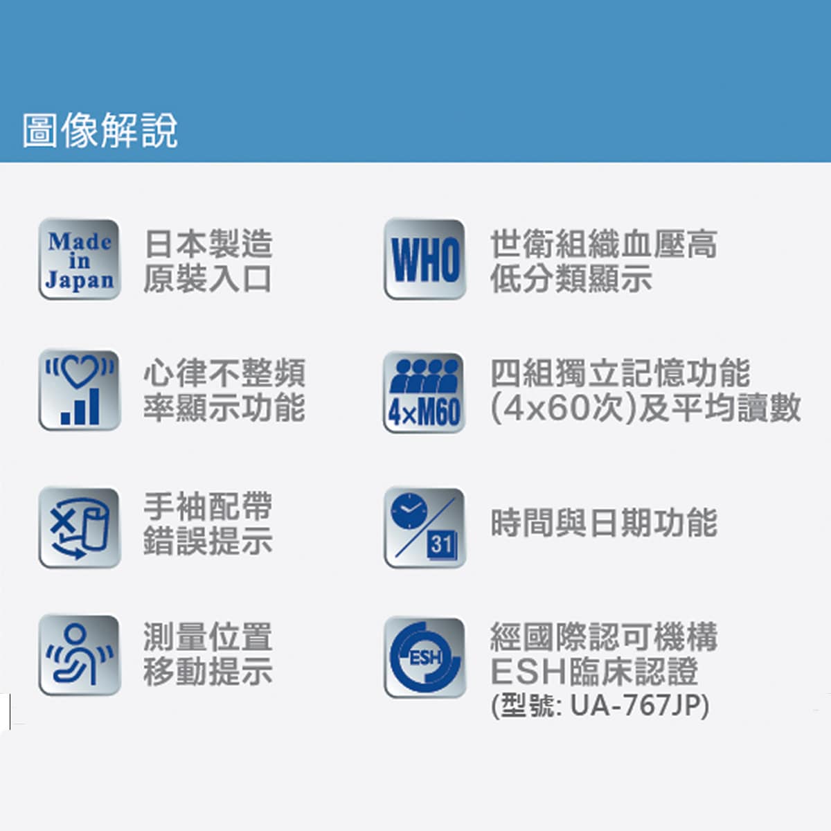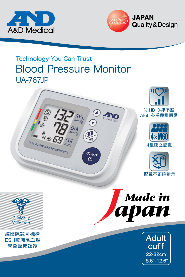 日本製造,承諾高質量檢測,並應用了最新技術針對家庭使用者,包含:四組獨立記憶功能(4x60次) ,方便不同家庭成員使用並可以比較服藥前後的數據統計。