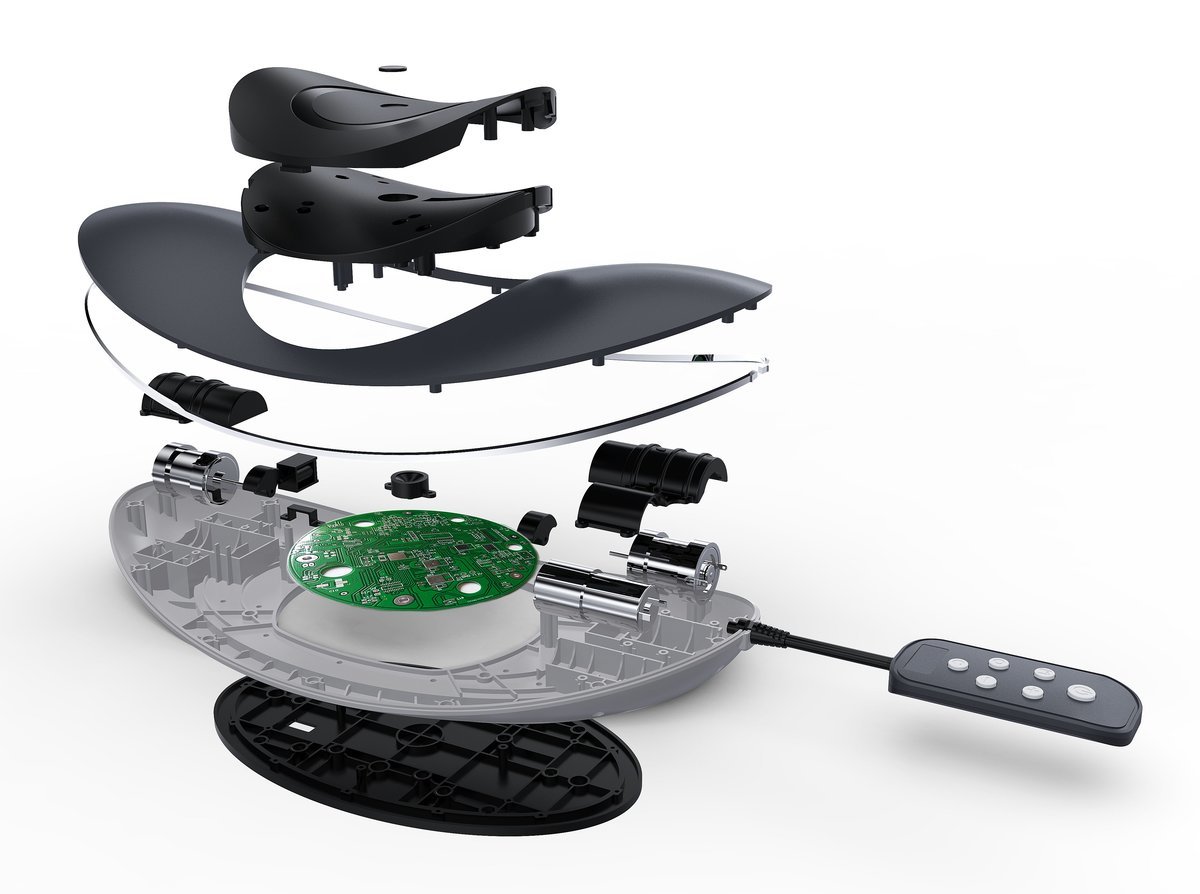 兩個高功率3000 rpm馬達符合人體工學設計以適合身體曲線採用ABS及PC物料,能夠承受超過200 kg配有肌肉電流刺激貼以按摩身體其他部位