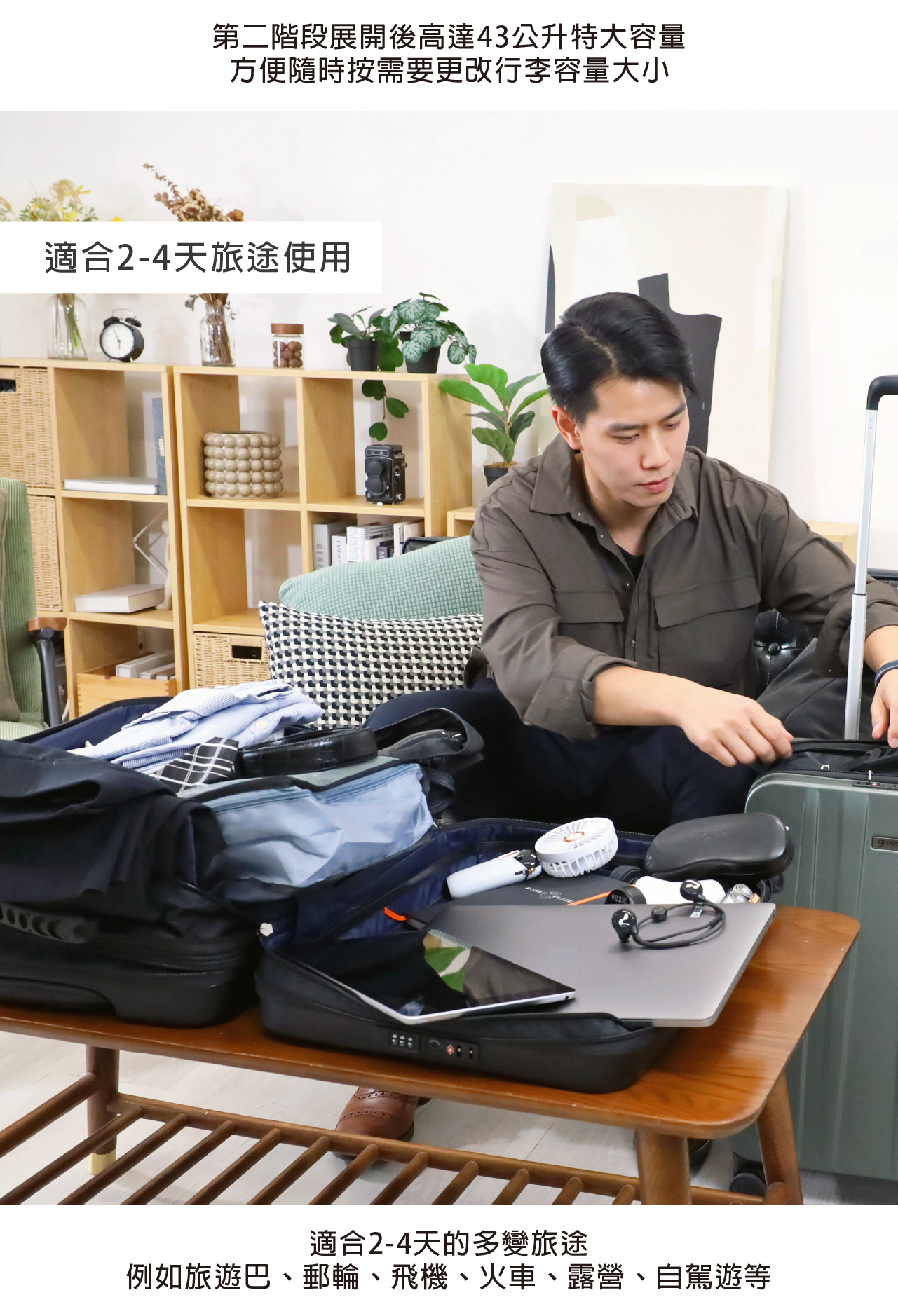- 3段式增量|容量23-43L秒速增減,手提/寄艙都OK