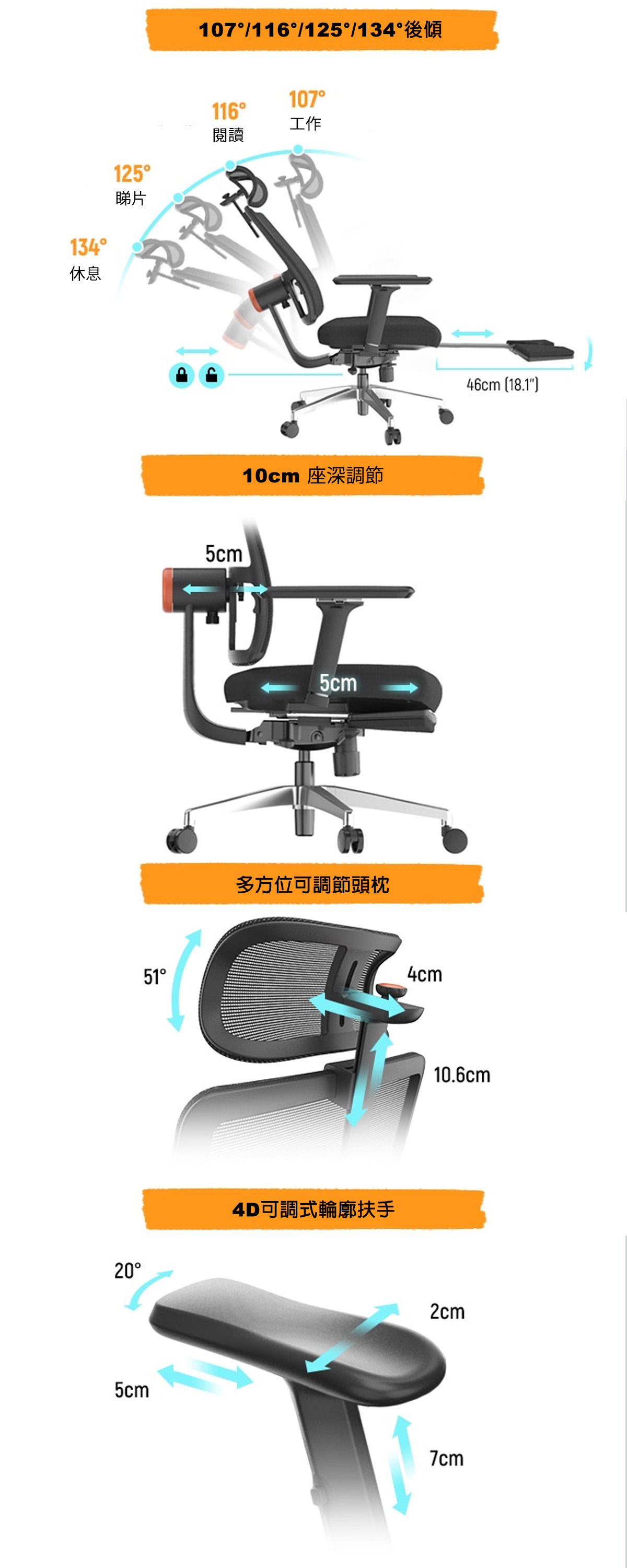 扶手在輪廓設計時充分考慮了您的舒適度,可上下、左右、前後、20度轉動調節,提供卓越的支撐並減輕肘部、手臂和肩膀的疲勞。