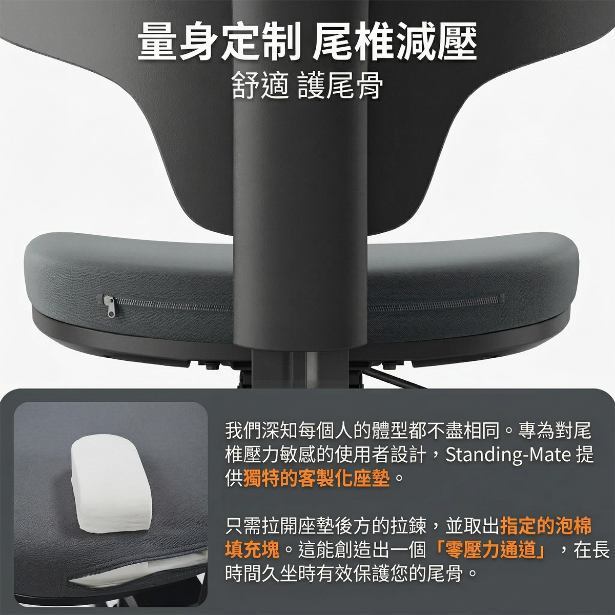 我們深知香港辦公與居住空間寸金尺土。Standing Mate 獨家配備可伸縮的防疲勞腳踏墊 (Retractable Footrest)。站立或半坐時拉出,為足底提供柔軟緩衝;坐下時只需輕輕一推即可收納於椅底,完全不阻礙走道,維持空間整潔。