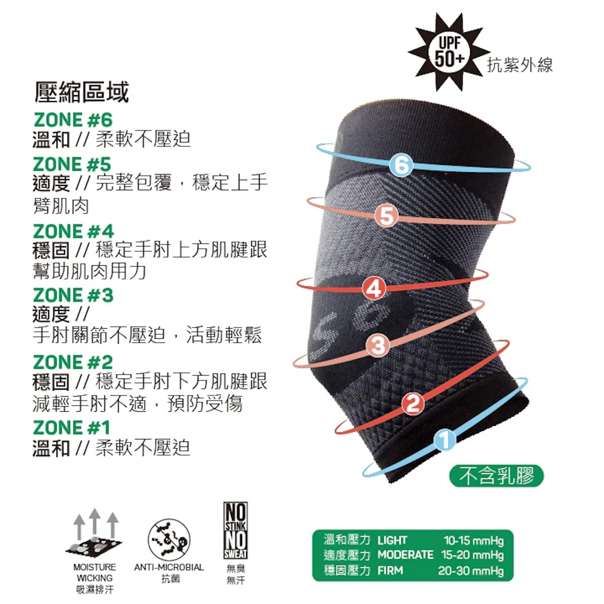 OS1st ES6™ 階段式壓力手肘套讓您在穿戴時不影響活動,使用抗敏止滑凝膠幫助護具固定在手肘位置,給予手肘肌肉與關節穩定及支撐,非常適合在運動訓練時使用。