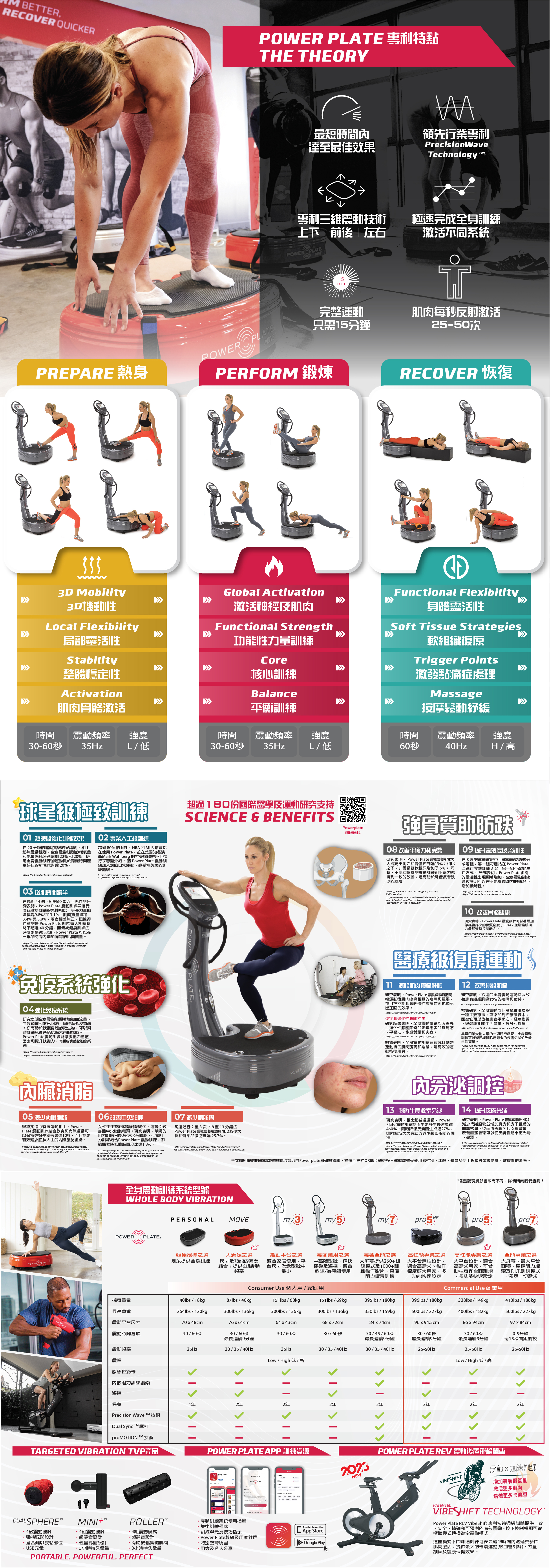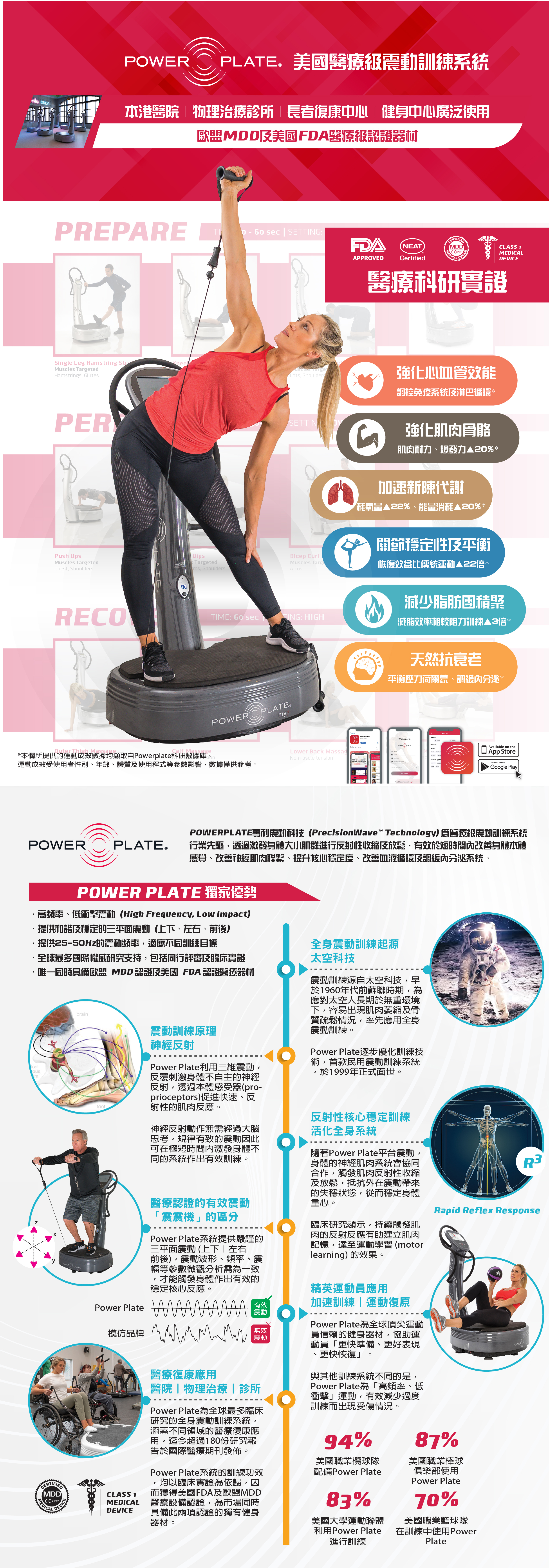 Power Plate震動訓練機之「加速訓練」(Acceleration Training®)是應用牛頓第二運動定律:F(力)=M(質量)×A(加速度)的物理原理,有別於大部份的運動以負重來增加強度的方式,Power Plate是透過每秒30~40次以上的高頻率震動所提高的「加速度」來增加運動的效果