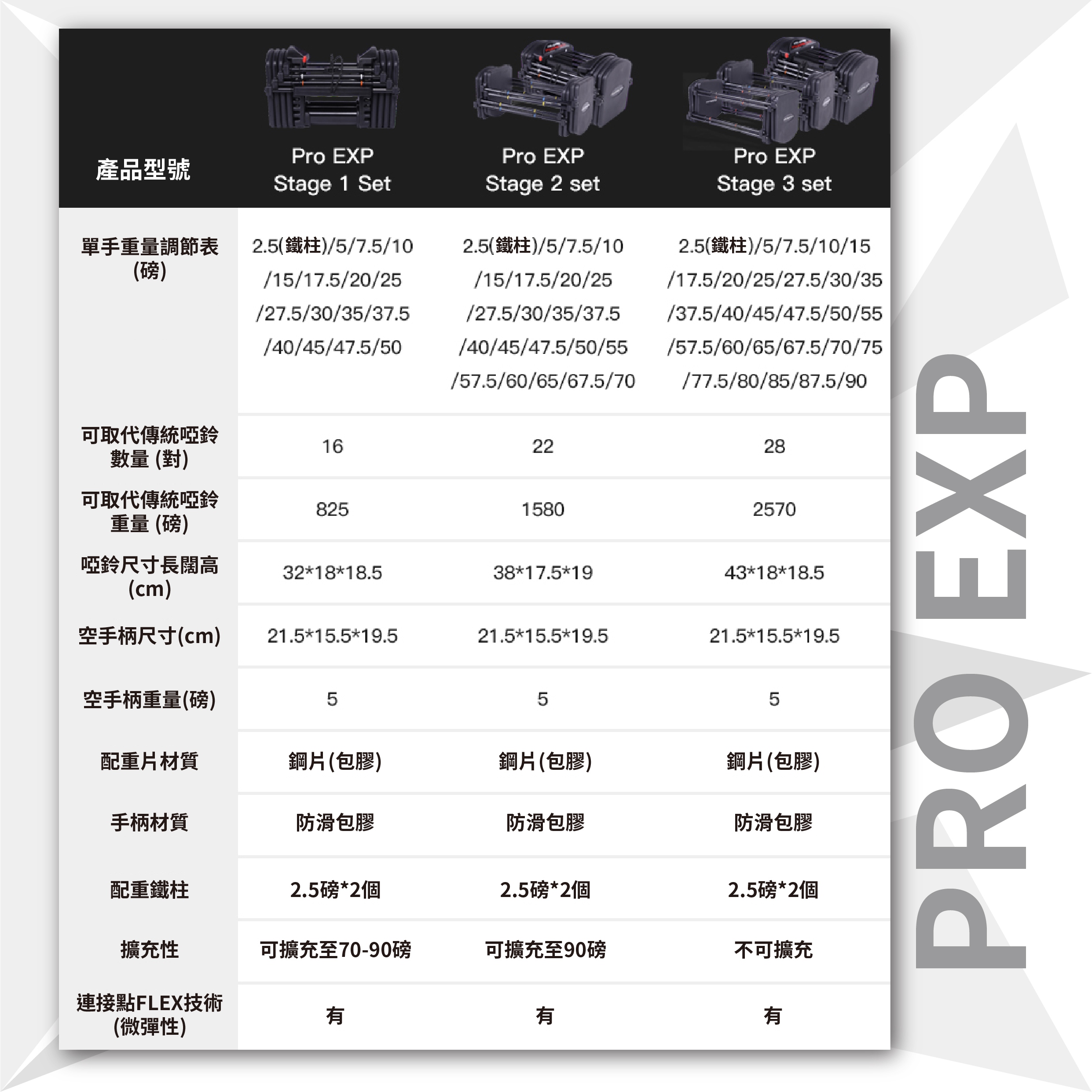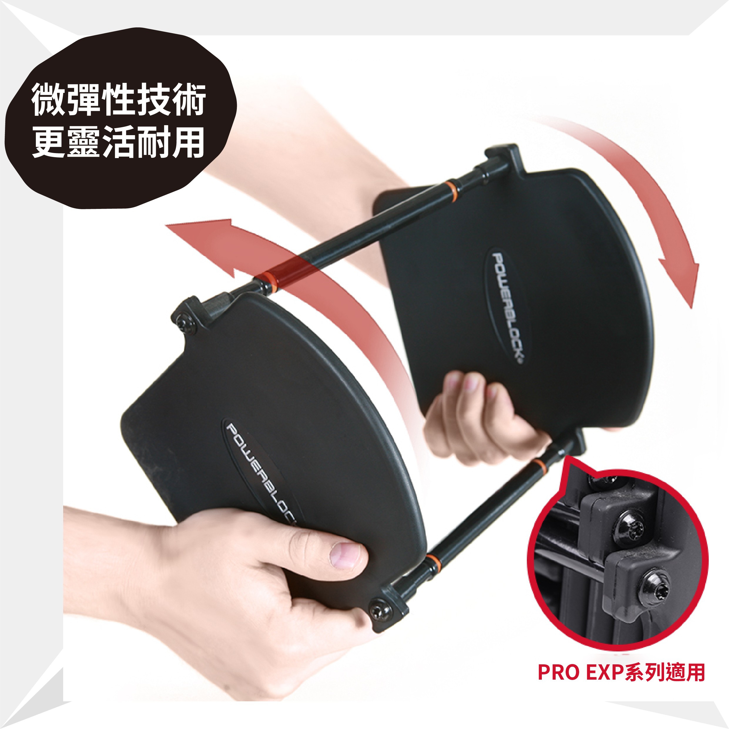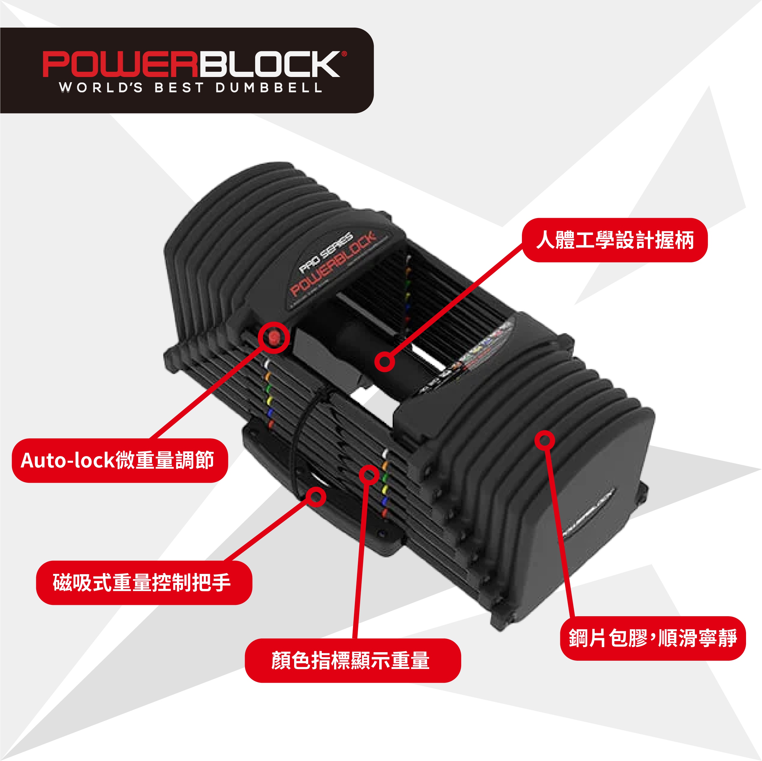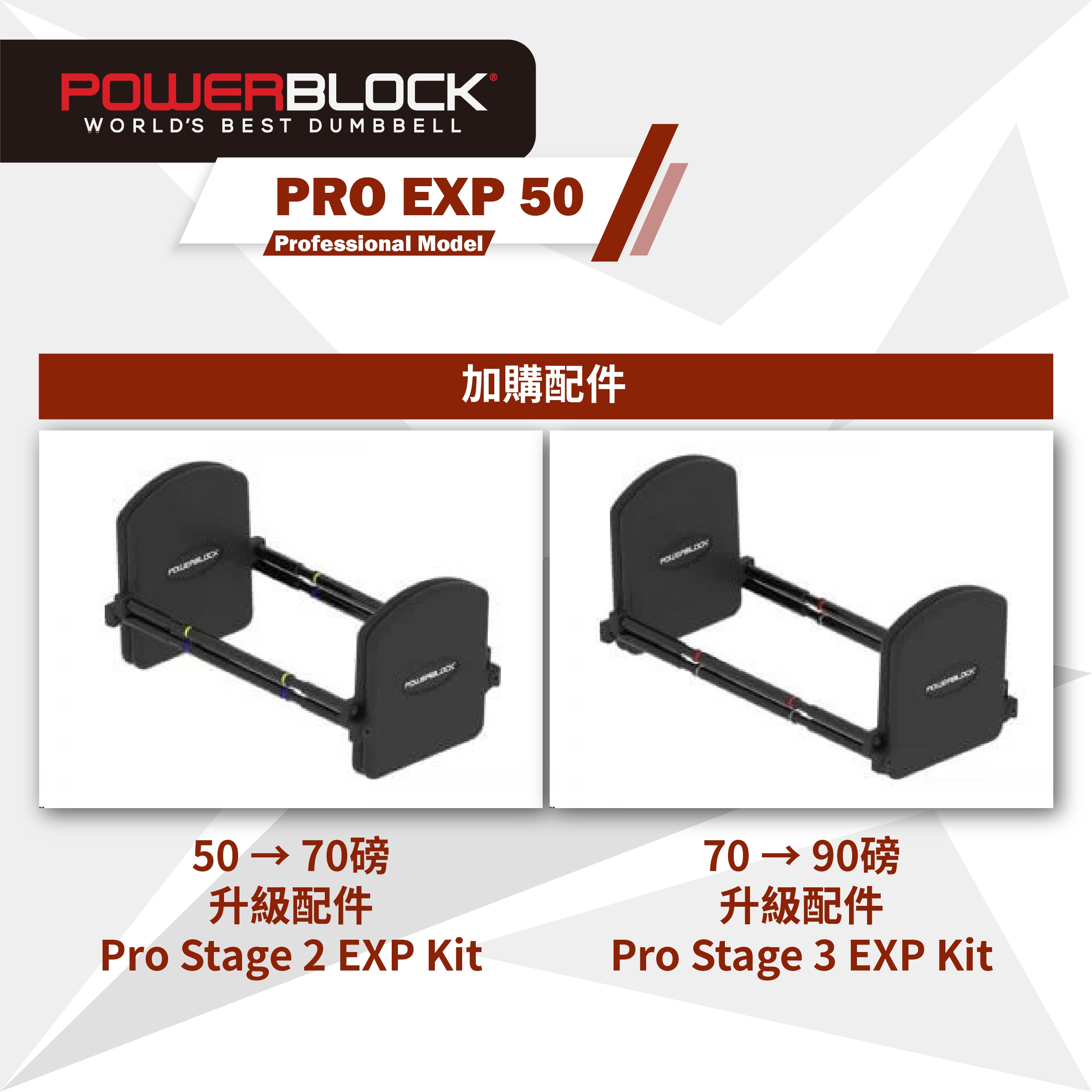 美國著名啞鈴品牌,擁有27年啞鈴設計及研發經驗,獲眾多NBA頂尖藍球隊選用。PowerBlock PRO EXP系列重量可由5磅調至50磅,以調重插杆快速調節重量,無需更換啞鈴片,方便慳位,可加購升級配件將重量擴充至70或90磅,另有專屬壺鈴配件及推桿可供選配。