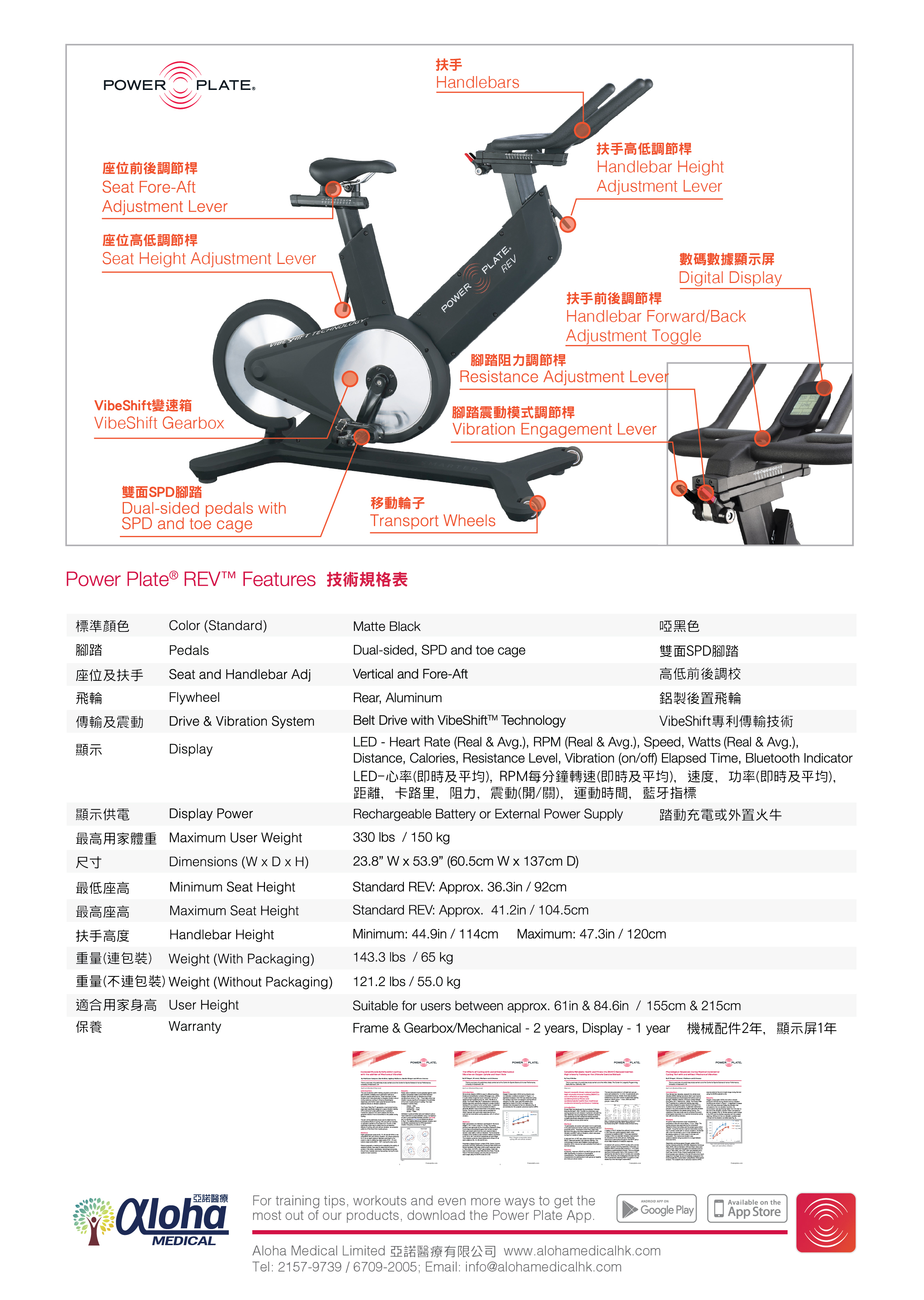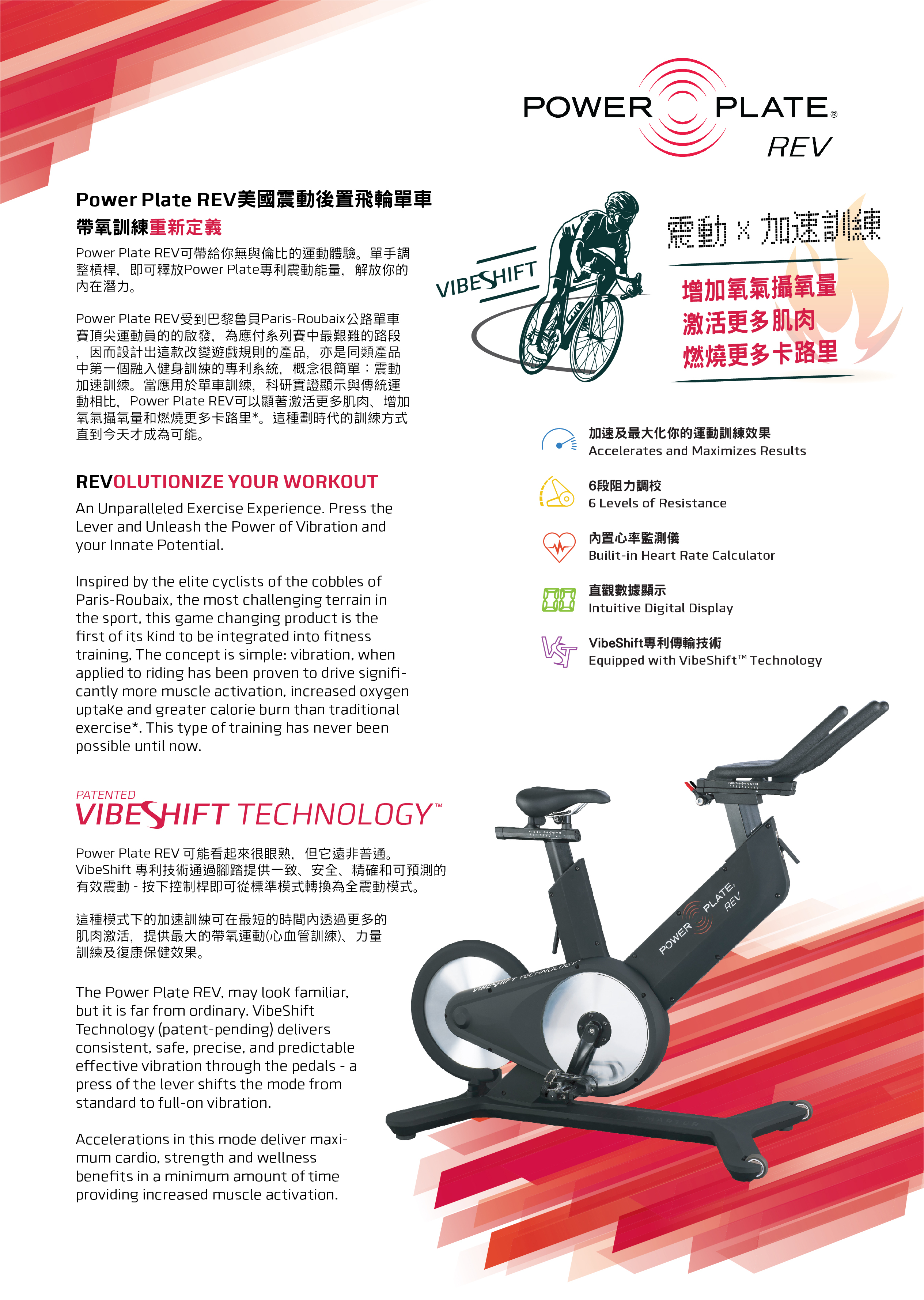 Power Plate REV受到巴黎魯貝Paris-Roubaix公路單車賽頂尖運動員的的啟發,為應付系列賽中最艱難的路段,因而設計出這款改變遊戲規則的產品,亦是同類產品中第一個融入健身訓練的專利系統,概念很簡單:震動加速訓練。當應用於單車訓練,科研實證顯示與傳統運動相比,Power Plate REV可以顯著激活更多肌肉、增加氧氣攝氧量和燃燒更多卡路里*。這種劃時代的訓練方式直到今天才成為可能。
