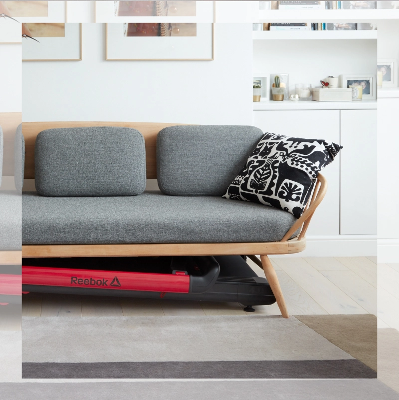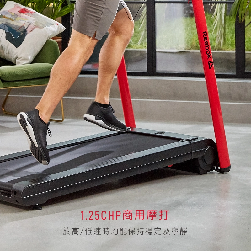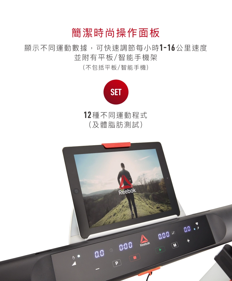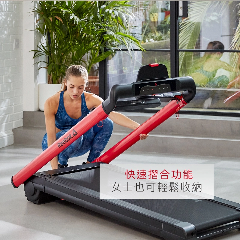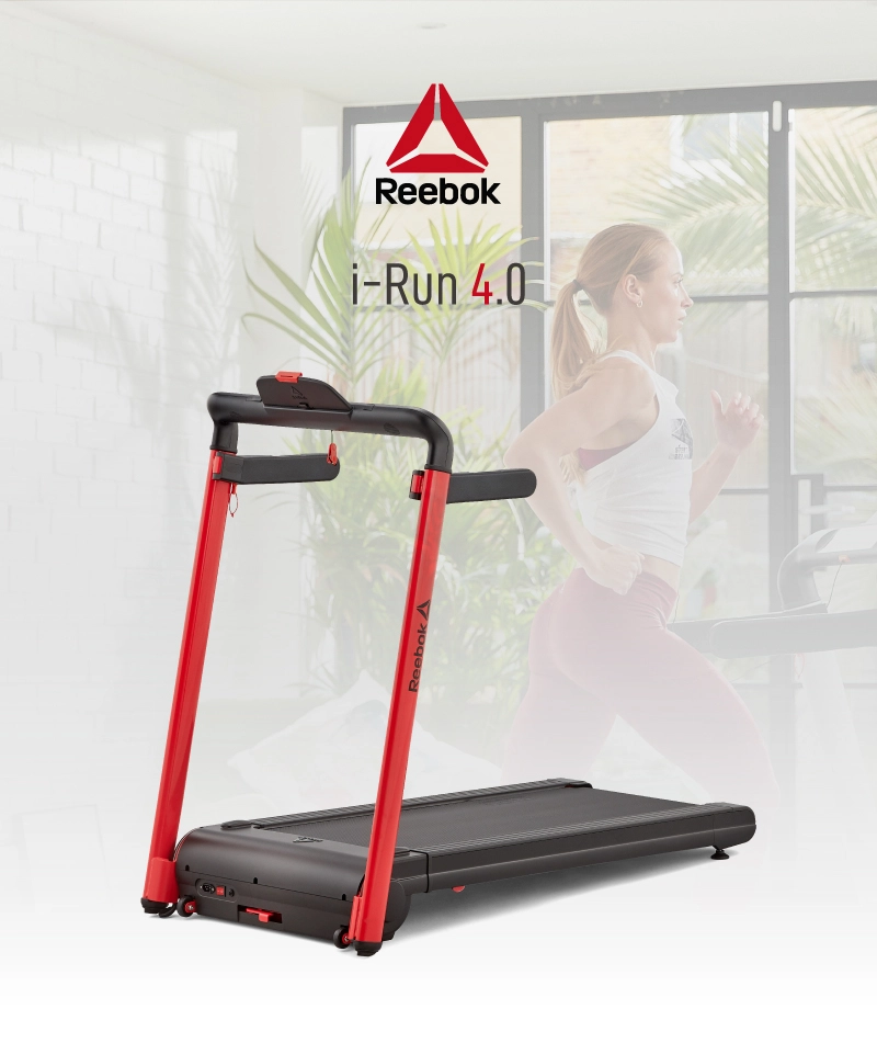 Reebok全新全機摺合家用跑步機! Reebok iRun 4.0 可收納於你家中任何一個角落, 特別照顧香港家庭的需要! 用家可利用快速摺合功能及底下的活動滑輪, 隨時收納及移動。 可調節速度 1-16kph, 12個預設運動程式, 4個顯示屏, 供用家隨時檢測運動數據。彈性緩衝跑帶, 減低噪音及對關節的負荷。附平板電腦/智能手機架, 用家可再利用影音裝置去提昇你的訓練及樂趣。