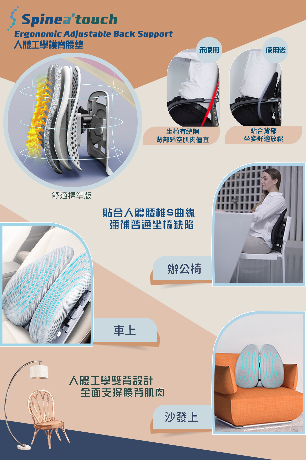 前豐田汽車人體工程學顧問 Kent Hatcher 聯合Spinea’touch 人體工程學團隊針對長時間久坐人士的痛點(包括坐姿問題、辦公室高度錯位問題及脊椎的長時間壓逼問題等),逐步開發各款人體工學腰墊,有助舒緩和預防腰背痛。