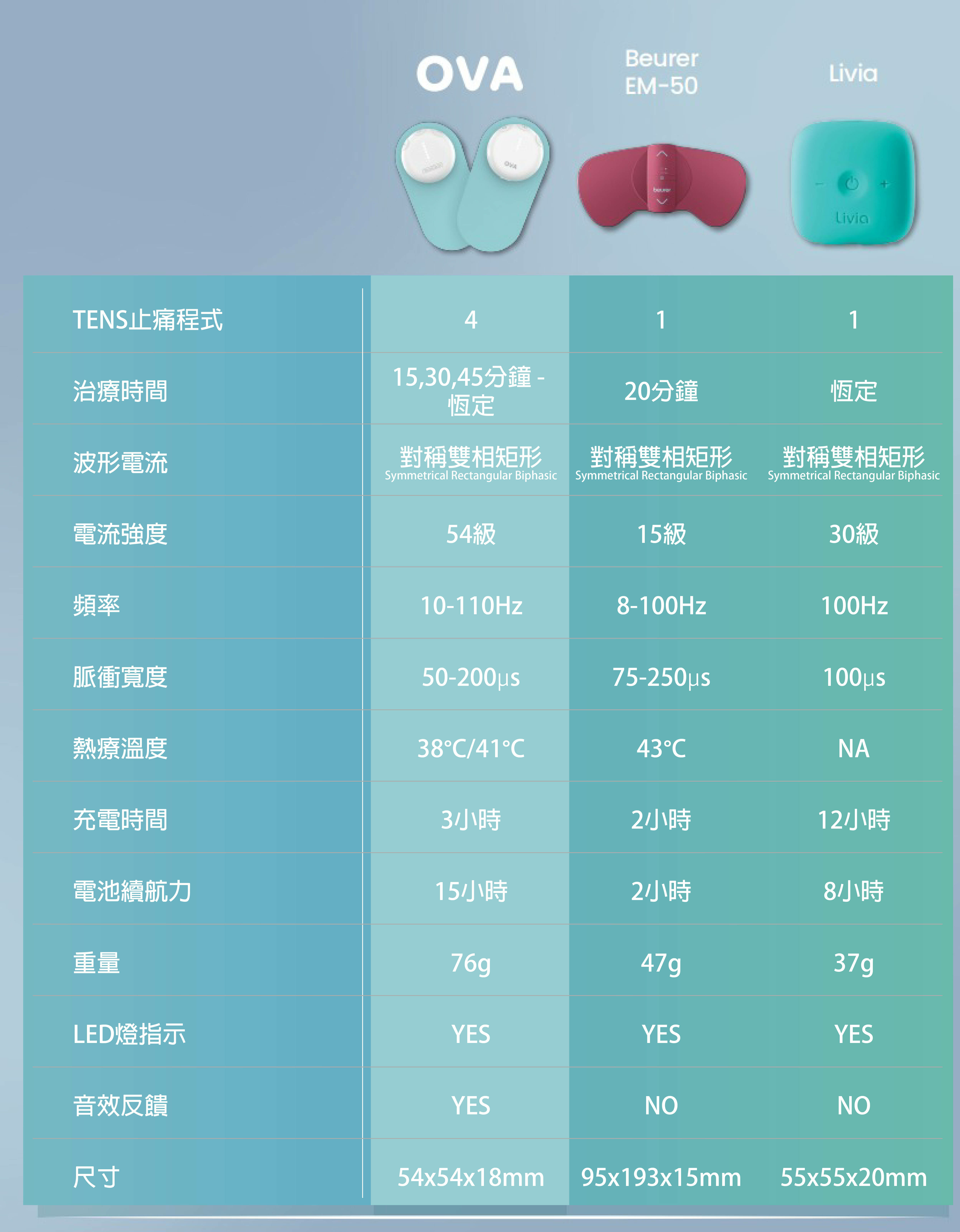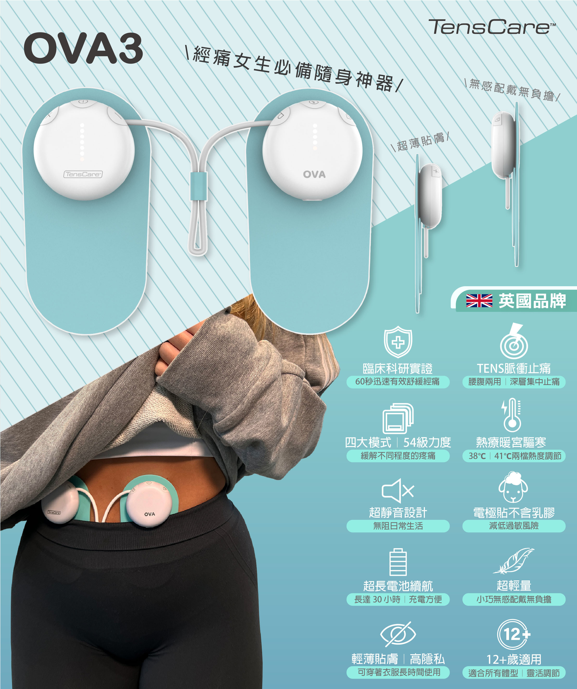 ‧ OVA3 源用門控理論的先進電療技術,傳送特定脈衝信號,使神經系統忙碌,阻隔疼痛信號傳送到大腦,輕柔連續的電流刺激交感神經及肌肉,使細胞產生天然鎮痛劑內啡肽,減少經痛。