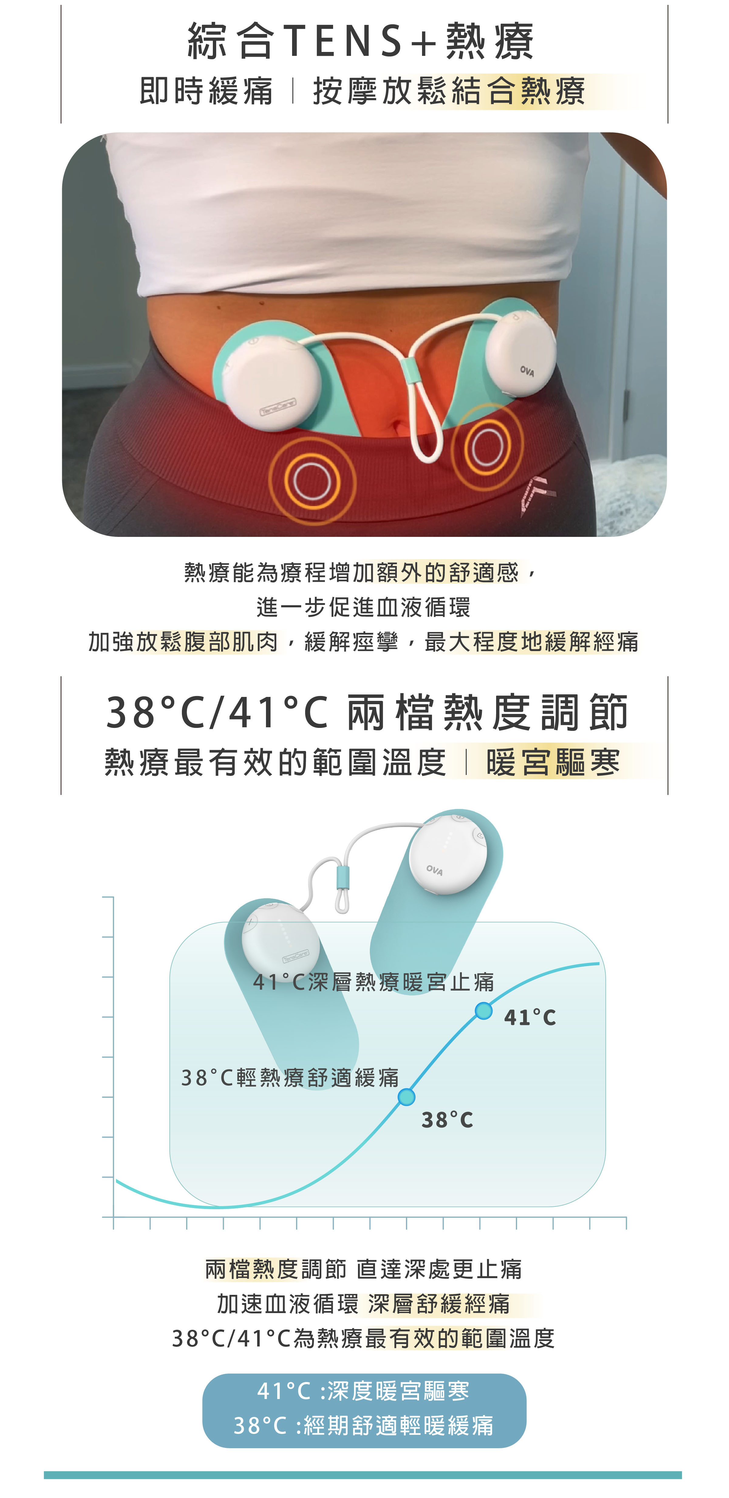 ‧ 熱療能為療程增加額外的舒適感,進一步促進血液循環,加強放鬆腹部肌肉,緩解痙攣,最大程度地緩解經痛。