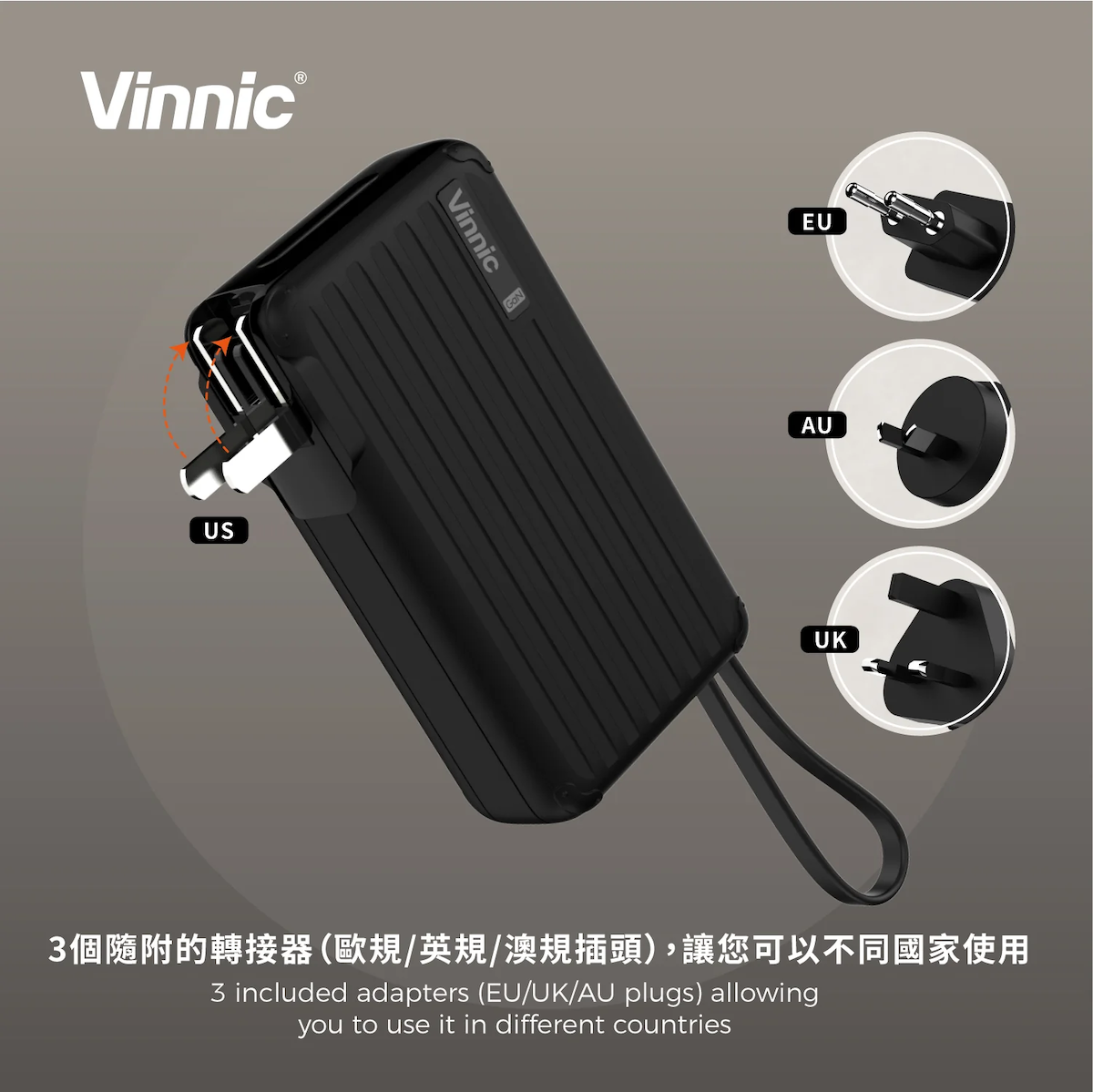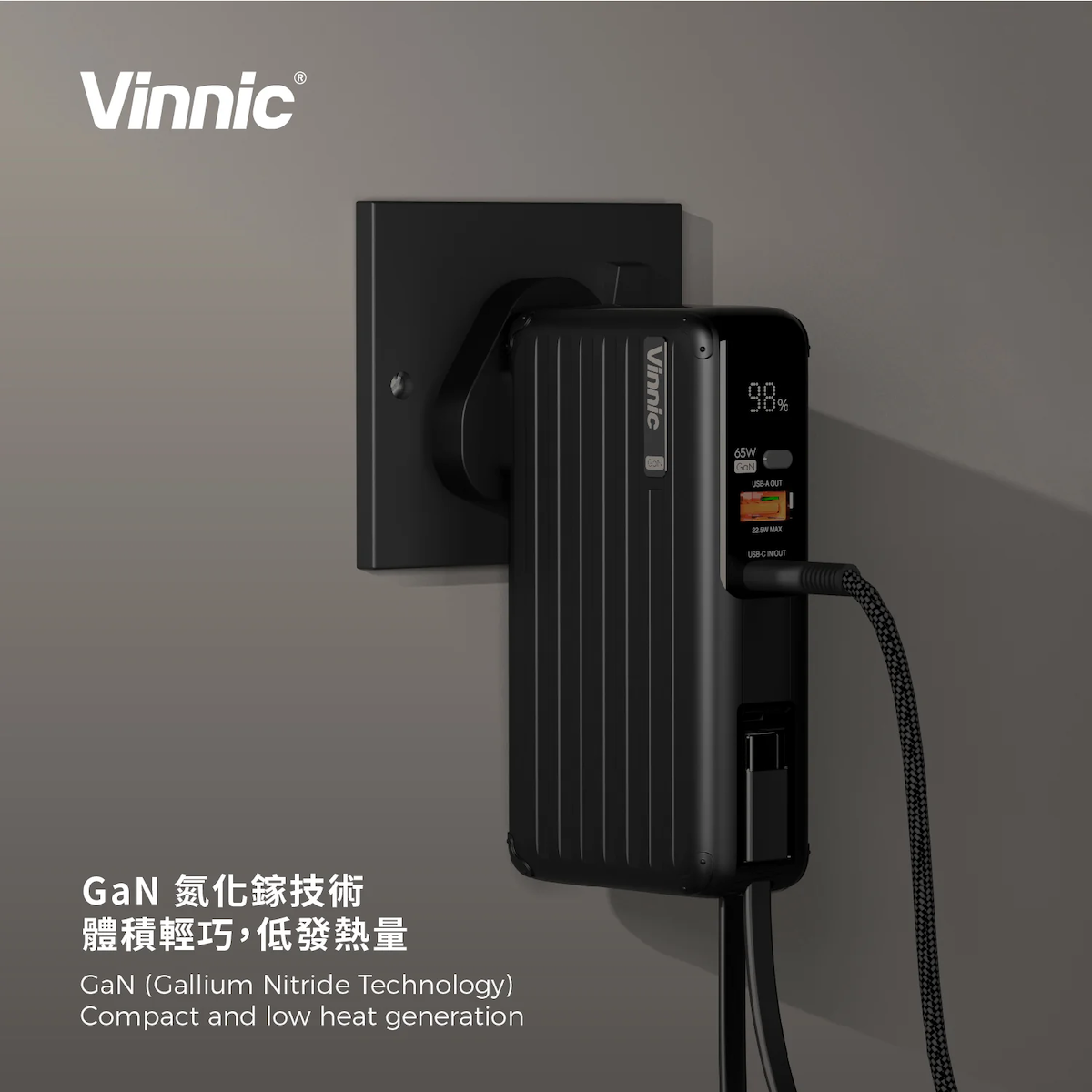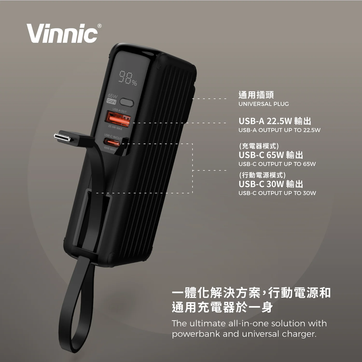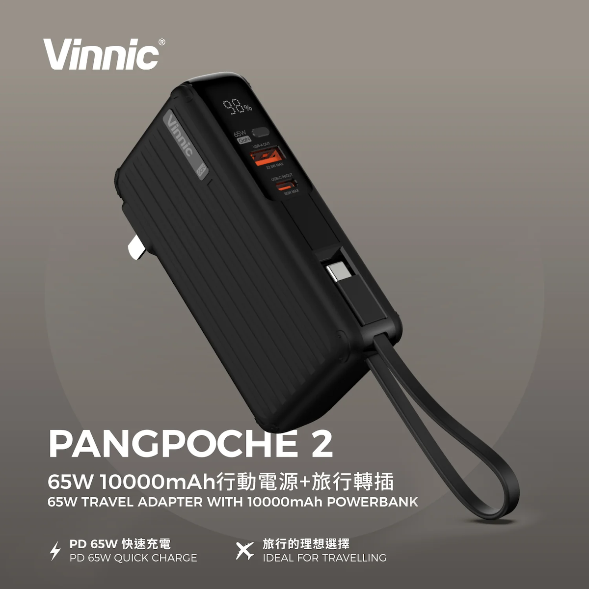 Vinnic PANGPOCHE 2 集充電器與行動電源於一身,配備 GAN PD 65W快充技術及 10000mAh 容量電池,更附送三款國際通用插頭(歐規/英規/澳規),完美配合環球旅行需求。PANGPOCHE 2 採用先進 PD 快充技術,最高可輸出 65W 功率,內建 10000mAh 容量電池可作為行動電源使用。設有雙 USB-C 及單 USB-A 輸出端口,支援多裝置同時充電,其中自帶 USB-C 充電線最高可達 65W 輸出,而 USB-A 端口則提供 22.5W 輸出。產品配備電量顯示屏方便查看剩餘電量,並隨附三款國際轉接頭,是商務人士及旅行者的理想之選,一機滿足所有充電需求。